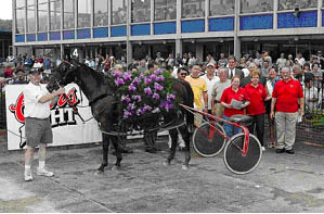the trophy and blanket of orchids to the 1999 Adios Champ, who was driven to